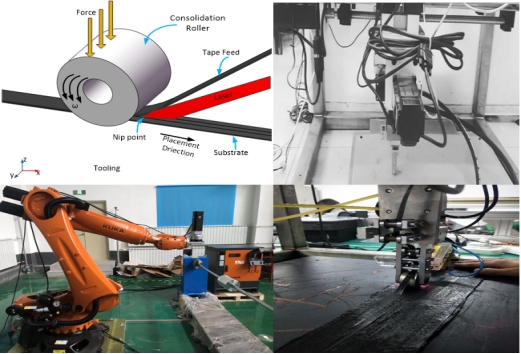 復(fù)合材料以其優(yōu)越的力學(xué)性能、高強(qiáng)度、低密度、高模量、耐高溫、耐腐蝕、熱膨脹系數(shù)低和生體相容性好等特性被廣泛應(yīng)用。但復(fù)合材料傳統(tǒng)熱壓成型技術(shù)中,表面樹脂基對(duì)增強(qiáng)碳纖維材料浸潤(rùn)性差、層間孔隙難以排除及成型過程中樹脂流動(dòng)不均勻,據(jù)此復(fù)合材料鋪放成型機(jī)器人應(yīng)用而生。復(fù)合材料成型機(jī)器人采用激光作為光源,對(duì)預(yù)浸膠帶預(yù)熱、熔融粘接;采用紅外測(cè)溫儀進(jìn)行測(cè)溫并進(jìn)行溫度補(bǔ)償,實(shí)現(xiàn)加熱點(diǎn)溫度精確測(cè)量,提高鋪放質(zhì)量。采用隨動(dòng)壓輥保壓;同時(shí),工業(yè)機(jī)器人搭配成型裝置作為移動(dòng)平臺(tái),提升系統(tǒng)的靈活性和工作空間,適用于各類工件和不同尺寸部件的成型。由于采用預(yù)浸料和低張力不受落紗穩(wěn)定性的約束,可以根據(jù)設(shè)計(jì)要求選擇鋪層方向,可以實(shí)現(xiàn)多形體成型,提高制品質(zhì)量,提高生產(chǎn)效率。
