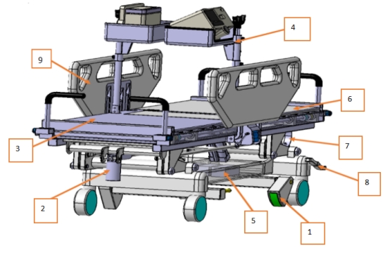 1床體防傾覆機(jī)構(gòu)、2床體升降機(jī)構(gòu)、3床面雙向平移機(jī)構(gòu)、4可伸縮式儀器設(shè)備架、5一體式電源、6靠背升降及臀位防滑脫機(jī)構(gòu)、7氧氣瓶放置架、8剎車系統(tǒng)、9護(hù)欄升降機(jī)構(gòu)。