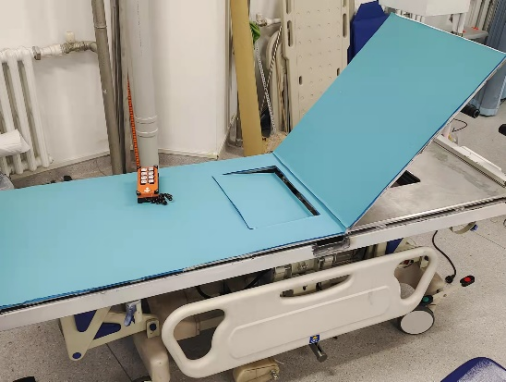 本機(jī)器人實(shí)現(xiàn)了與邊緣不規(guī)則的各種目標(biāo)床進(jìn)行無縫對(duì)接,降低了患者墜床和醫(yī)護(hù)人員腰背傷等職業(yè)傷害,減輕醫(yī)護(hù)人員工作負(fù)擔(dān),防止墜床事件發(fā)生;設(shè)計(jì)了床板雙向大行程平移機(jī)構(gòu),解決了床板工作行程受限導(dǎo)致患者墜床以及需大量人力轉(zhuǎn)運(yùn)導(dǎo)致醫(yī)護(hù)人員腰背傷等職業(yè)傷害問題;構(gòu)建了一體式電源供電模式,解決了轉(zhuǎn)運(yùn)途中設(shè)備蓄電不足,無法提供安全有效的生命支持問題;設(shè)計(jì)了一種用于醫(yī)用轉(zhuǎn)運(yùn)床的臀位防滑脫機(jī)構(gòu),解決了現(xiàn)有技術(shù)缺少臀位防滑脫功能靠背抬起時(shí)安全性不佳問題,防止患者滑脫。